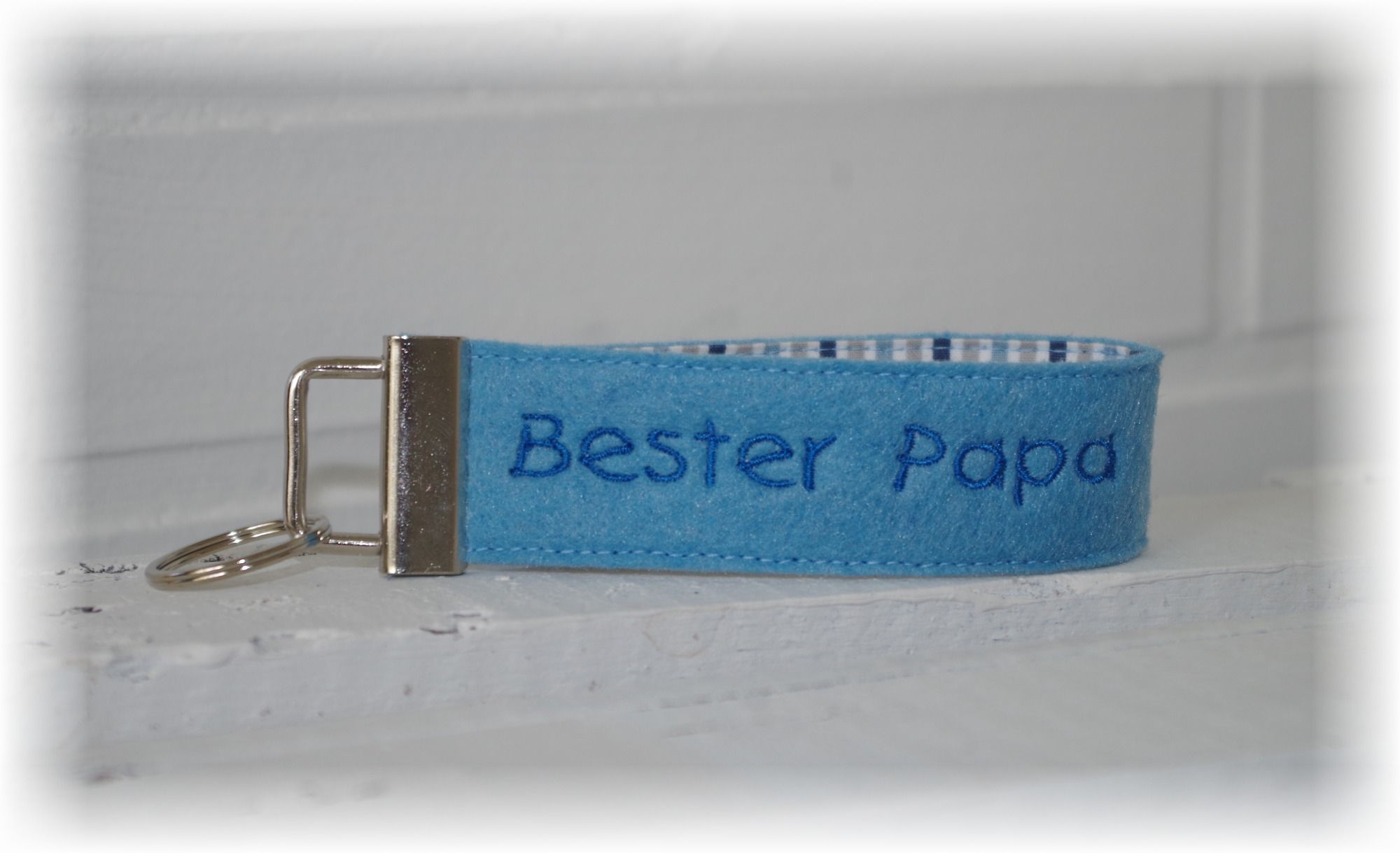Der Anhänger ist ca. 10 - 13 cm lang (je nach Text) und von innen mit einem passenden Baumwollstoff versäubert.